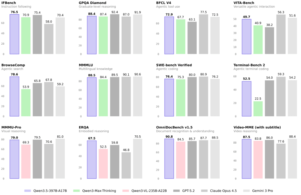 - Продуктивність рівня Frontier-моделей: Згідно з внутрішніми тестами, версія Qwen 3.5-Plus (доступна через хмарну платформу Alibaba Cloud) демонструє результати, що не поступаються або навіть перевершують показники GPT-5.2 та Claude 4.5 у сферах логічного мислення та виконання складних інструкцій.